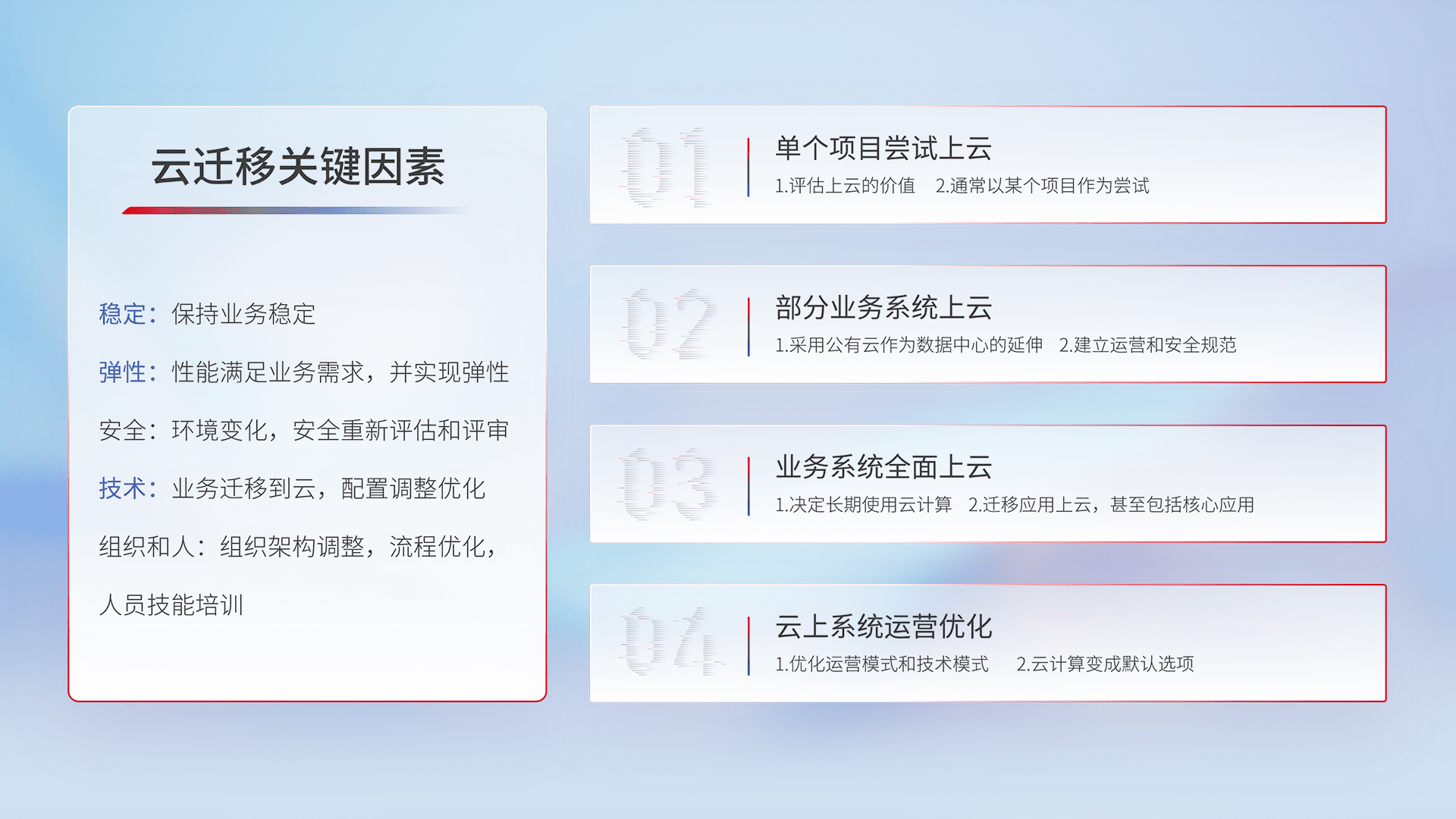结合实际业务,,,从规划设计、、云平台选型、、、、云原生改造、、、、数据迁移、、集成交付,,迁移全过程为客户识别最佳上云路径,,,,做好风险识别管理,,,设计网络架构、、、、身份权限、、、、安全审计合规、、、、操作审计、、日志审计、、、、监控告警策略、、、、多站点容灾设计等,,,,对云上基础设施进行整体规划,,提升IT治理水平,,以满足弹性、、高可用、、、高性能的需求。。