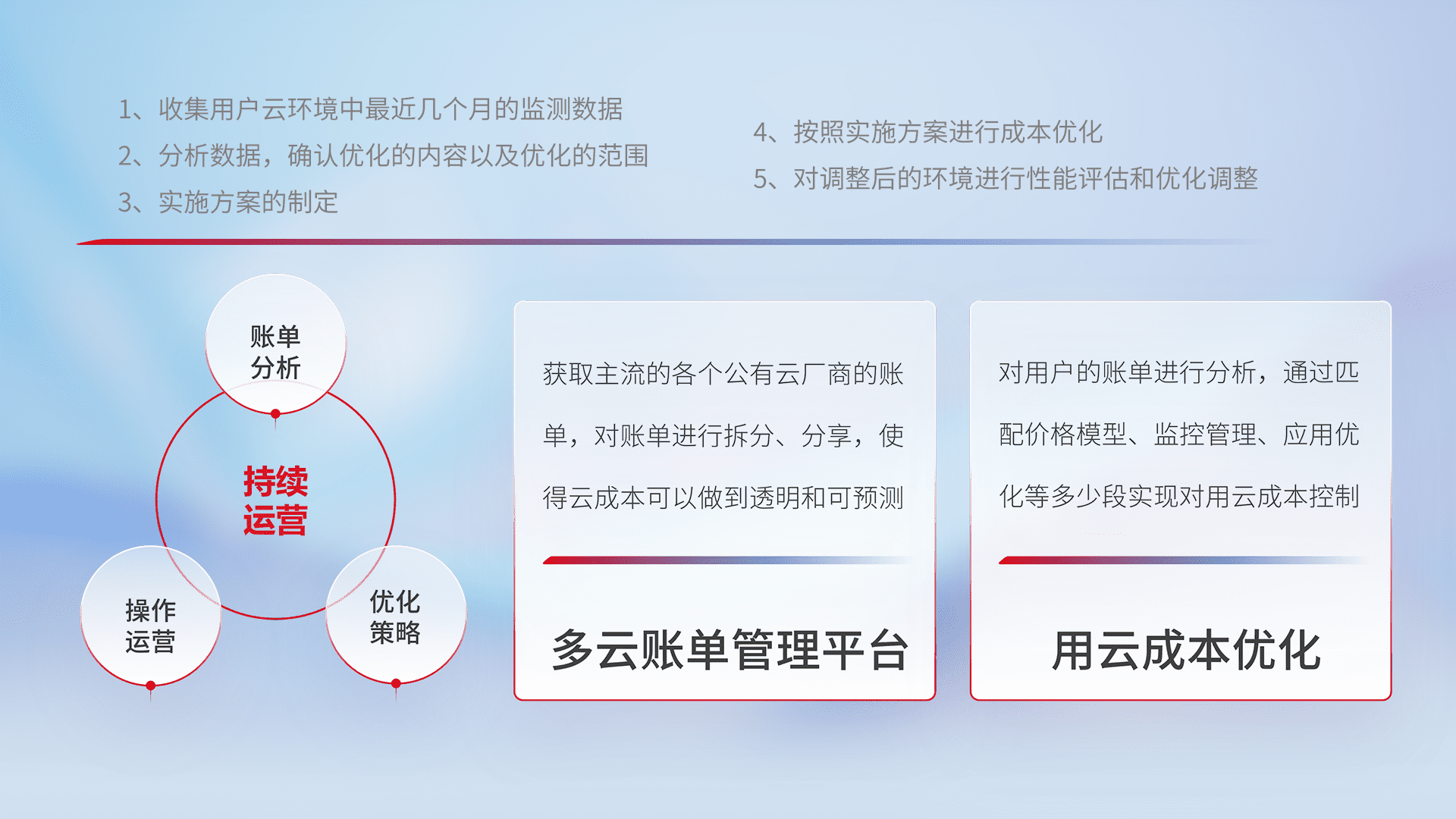通过多云纳管,,,以统一的资源数据模型把客户的云资源进行抽象和封装,,进而实现对多云资源的统一操作,,,保障云资源管理的可靠性、、稳定性与可用性。。量身定制化运维内容,,,,配置、、、、开发运维、、、、补丁管理、、备份、、、监控、、、认证和访问管理、、、、审计和日常巡检等,,,保障在用云过程中的可靠度,,稳定度以及高可用率。。。。